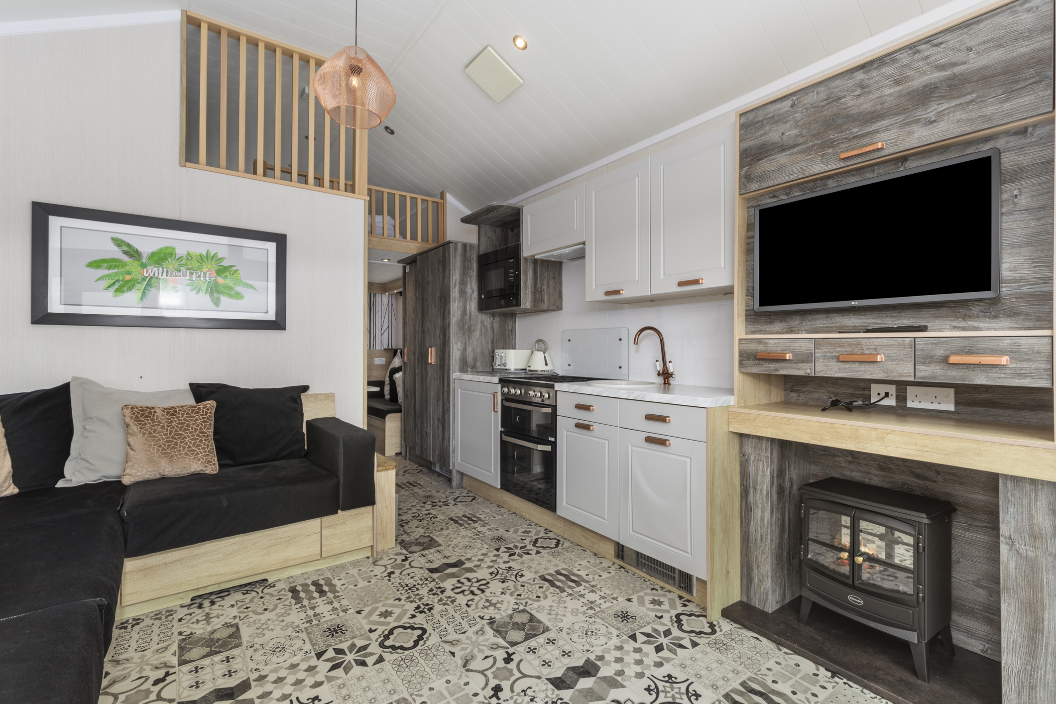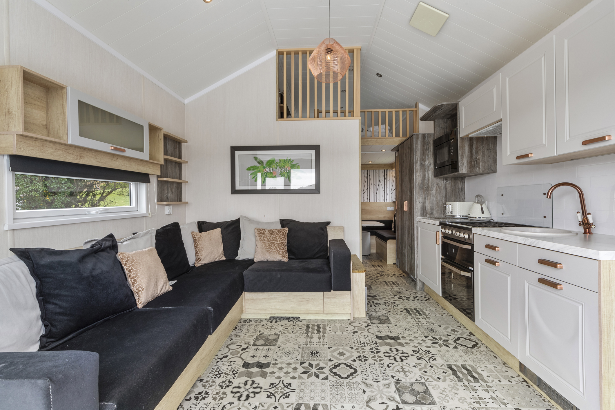 Step inside through the front door into an airy open-plan kitchen, living and dining area. Just to the left, you’ll find handy coat hooks and a shoe rack, so you can kick off your shoes and make yourself at home before exploring the rest of the lodge.