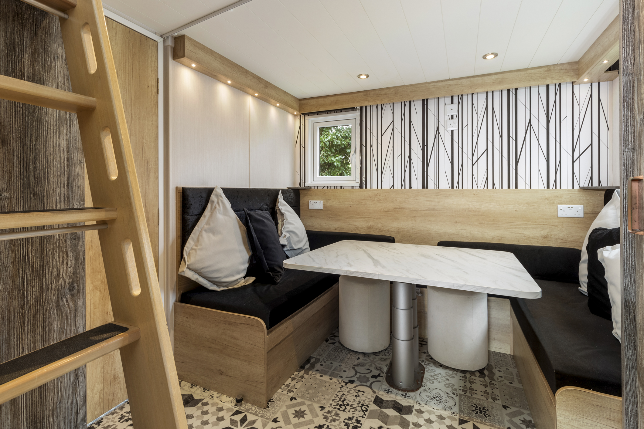 The cosy dining area is ideal for sharing meals together and can easily be converted into an extra sleeping space. The Dining table and benches can be converted into a cozy small sized double bed. This area also features a fitted wardrobe and handy storage for your belongings.
