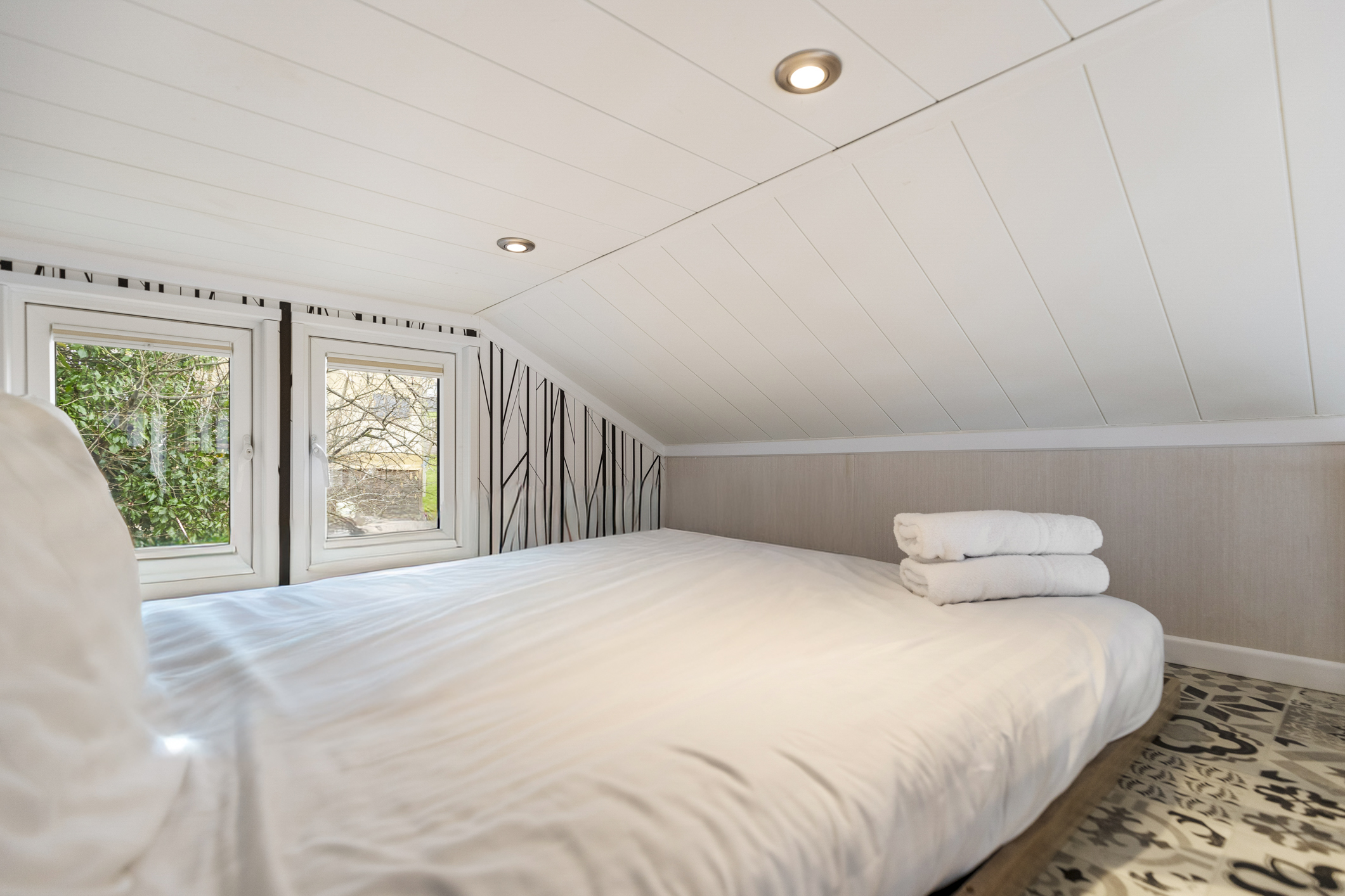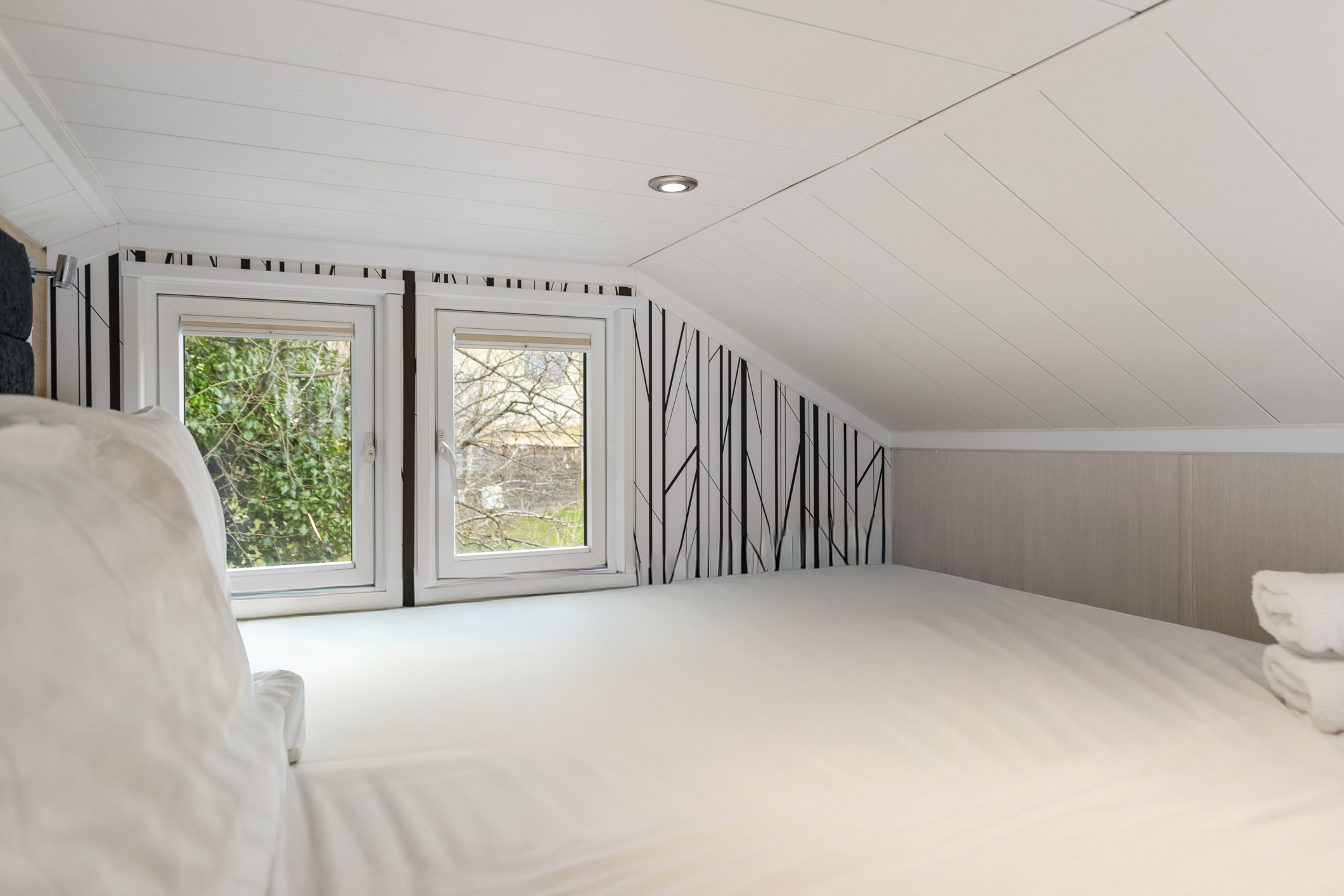 Ascend the wide ladder steps to the mezzanine floor, where a comfortable extra wide double bed awaits, snugly prepared for a peaceful night’s sleep. Please be aware that the ceiling height is lower in this space.