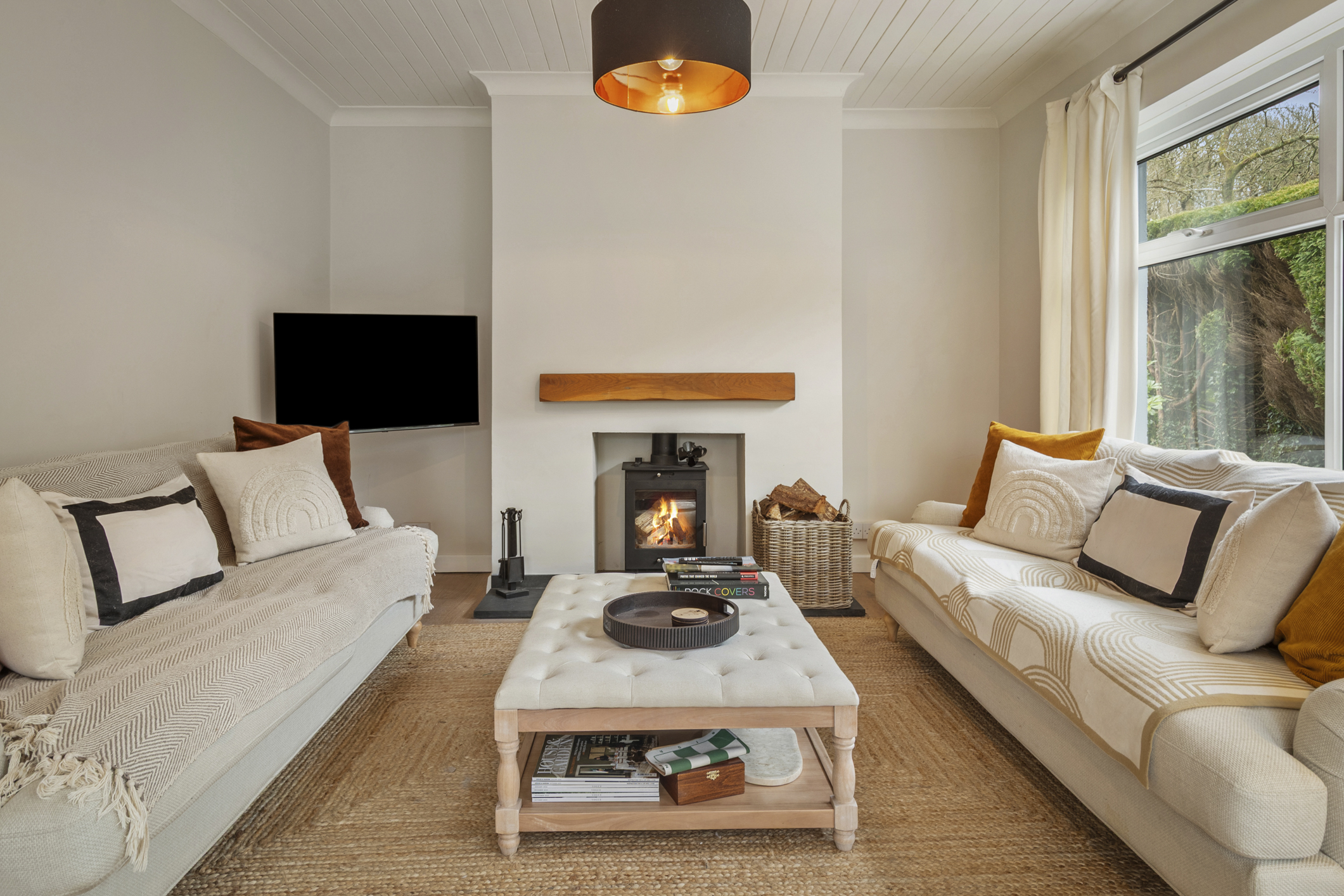 The lounge area features a warm and welcoming fireplace with a working log burner, creating a cosy atmosphere on cooler evenings. Two generous sofas make this the perfect spot to relax with family and friends while watching TV, reading, or simply sharing stories and laughter.