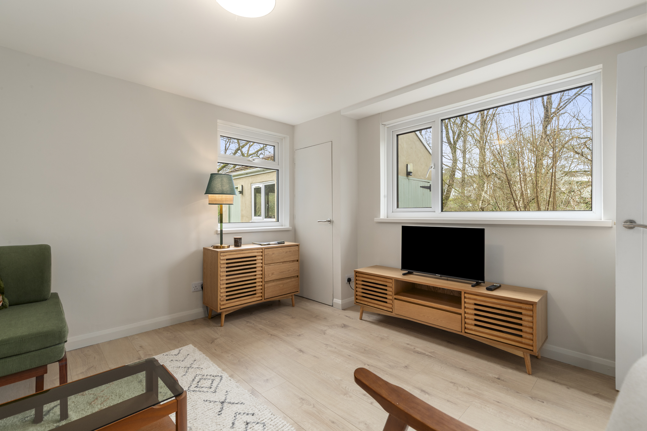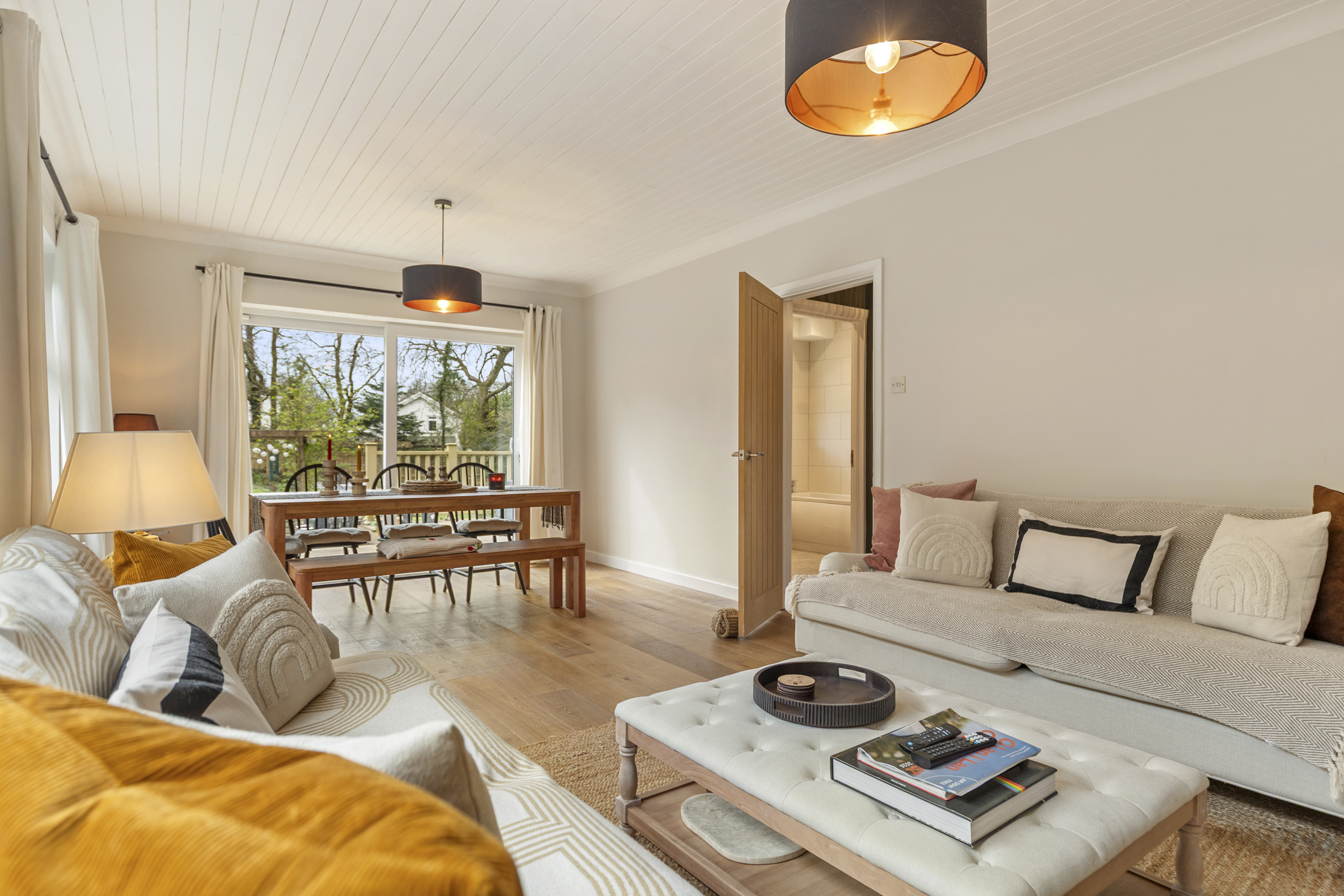 The annexe also features a cosy yet spacious lounge, complete with mid-century style chairs for relaxing in front of the TV or putting your feet up with a good book for some quiet time.