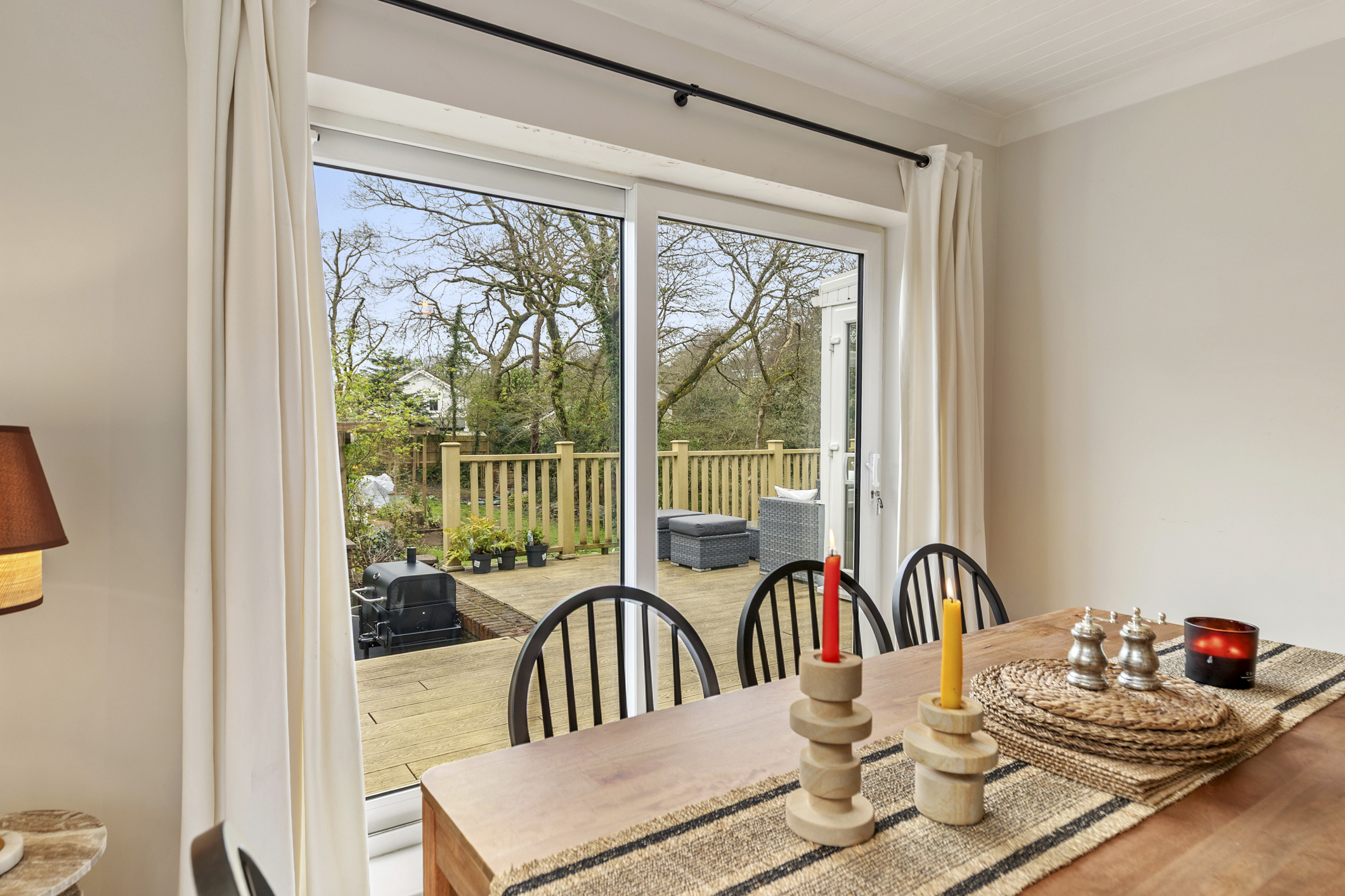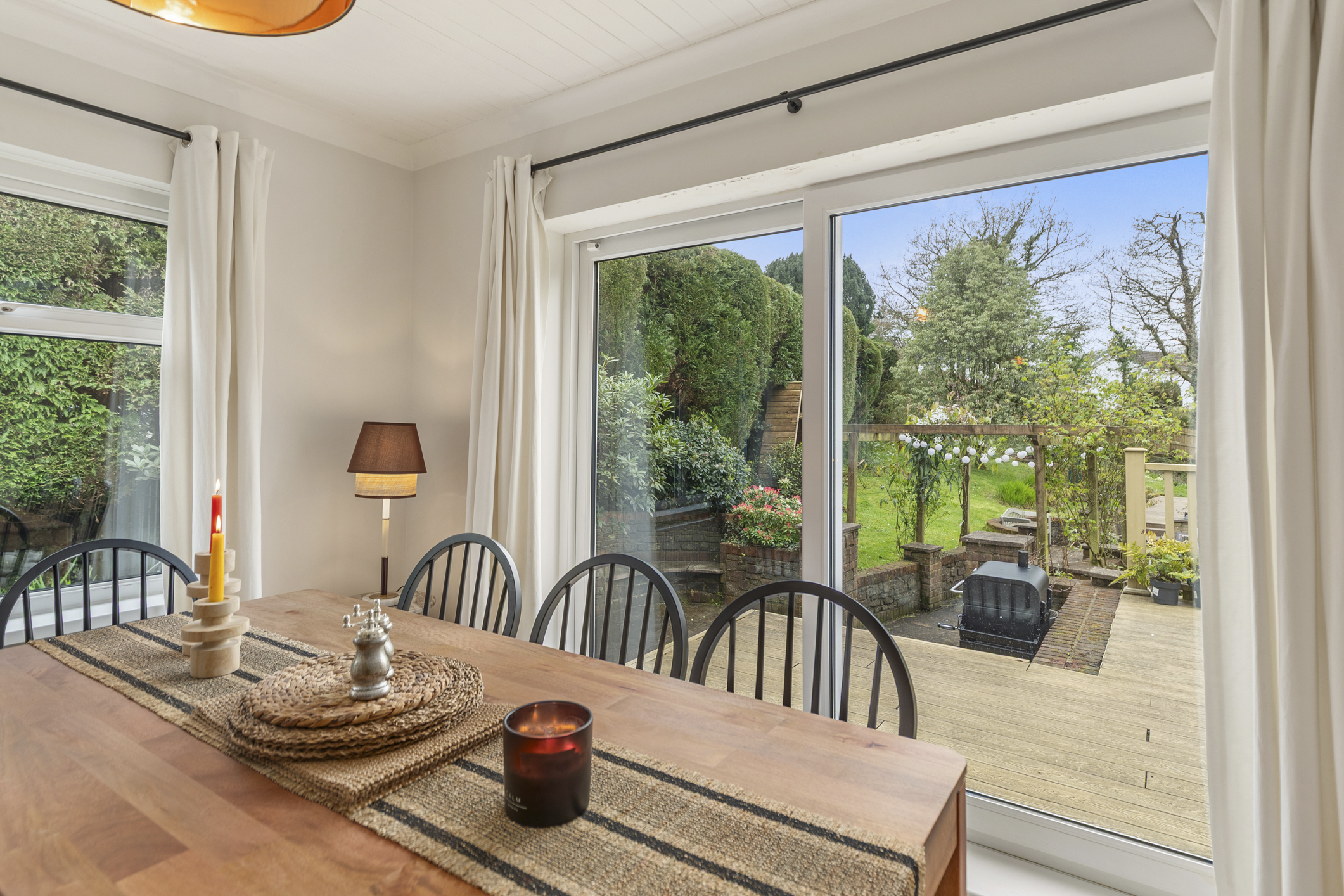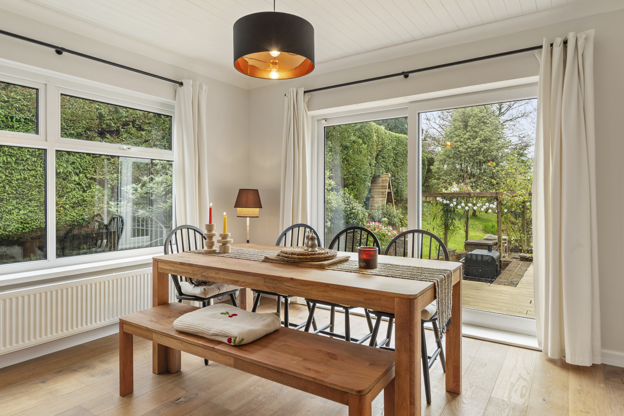 Beside the dining area, patio doors open wide onto a beautifully maintained, long garden, offering a lovely view and an easy connection to the outdoors.