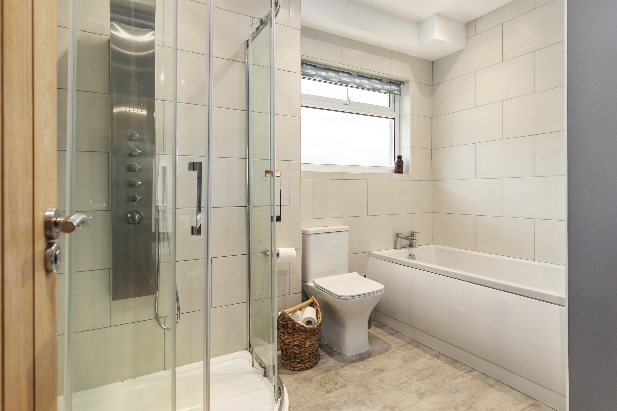 Located at the end of the hallway, the bathroom features a pristine, standalone walk-in, tower-style shower, creating a fresh and modern space to start your day. Alternatively, unwind and relax in the bath at the end of a lovely day. The room also includes a heated towel rail, toilet, and a wash hand basin with convenient drawers to keep toiletries and cosmetics neatly tucked away. A mirror completes the space, adding both practicality and style.