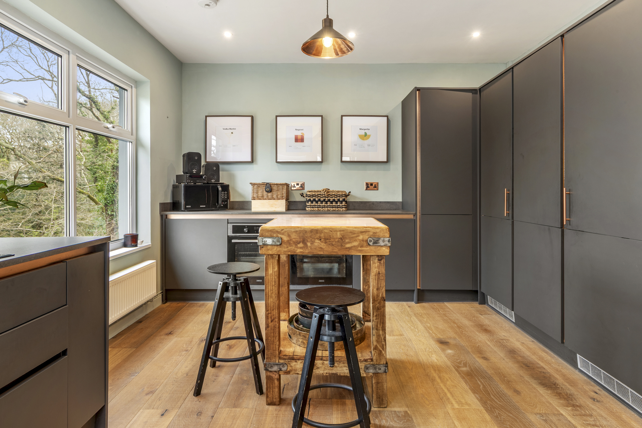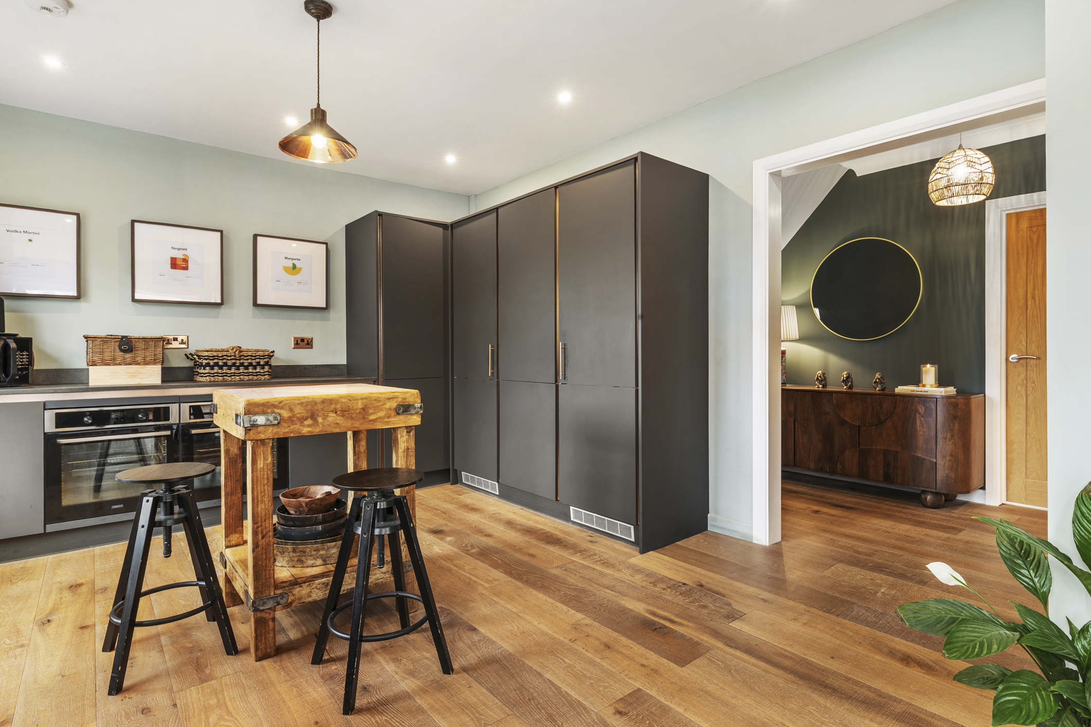 At the centre of the kitchen, a vintage butcher’s block worktable takes pride of place where you can enjoy a morning cuppa, sitting on a stool, and easing into the day with breakfast.