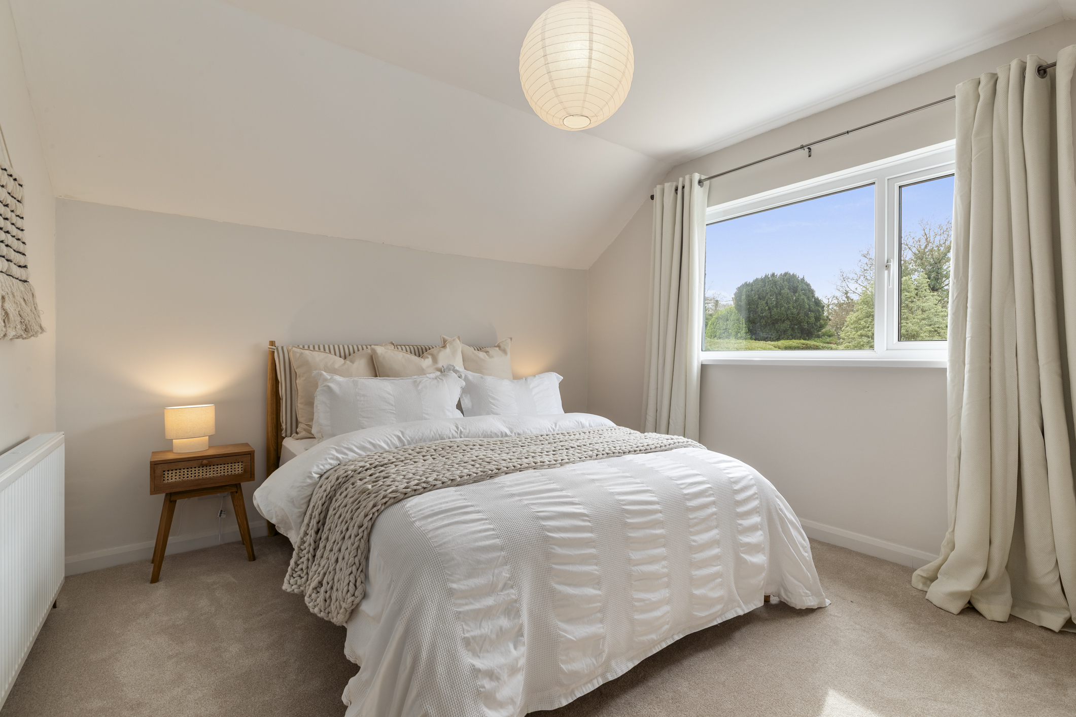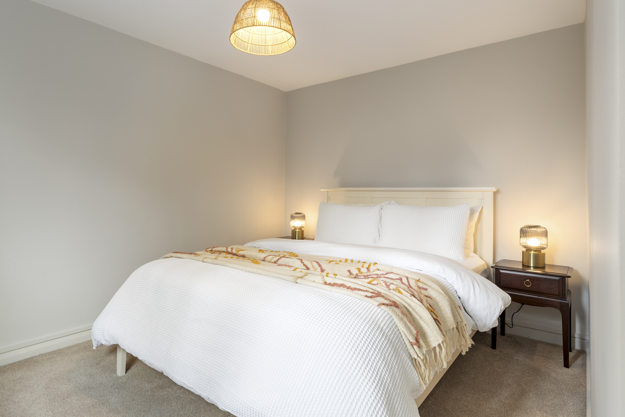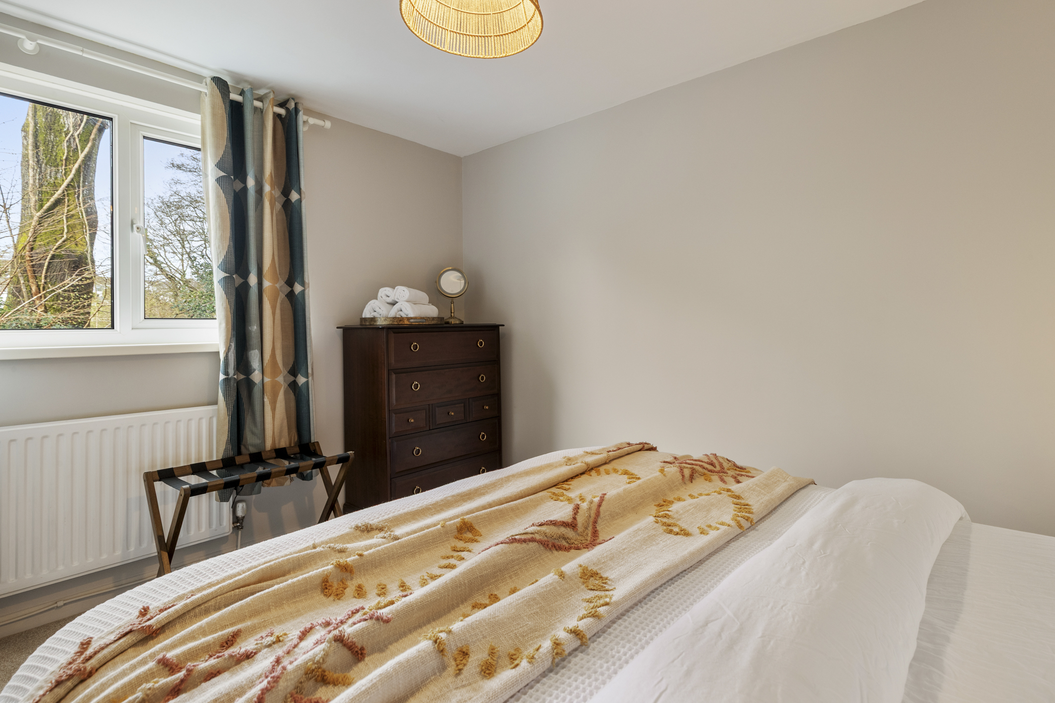 Upstairs, you’ll find a bright and airy king-sized bedroom, offering a peaceful retreat. The room is thoughtfully furnished with a comfortable king-sized bed, bedside table and lamp, and a chest of drawers for your belongings.