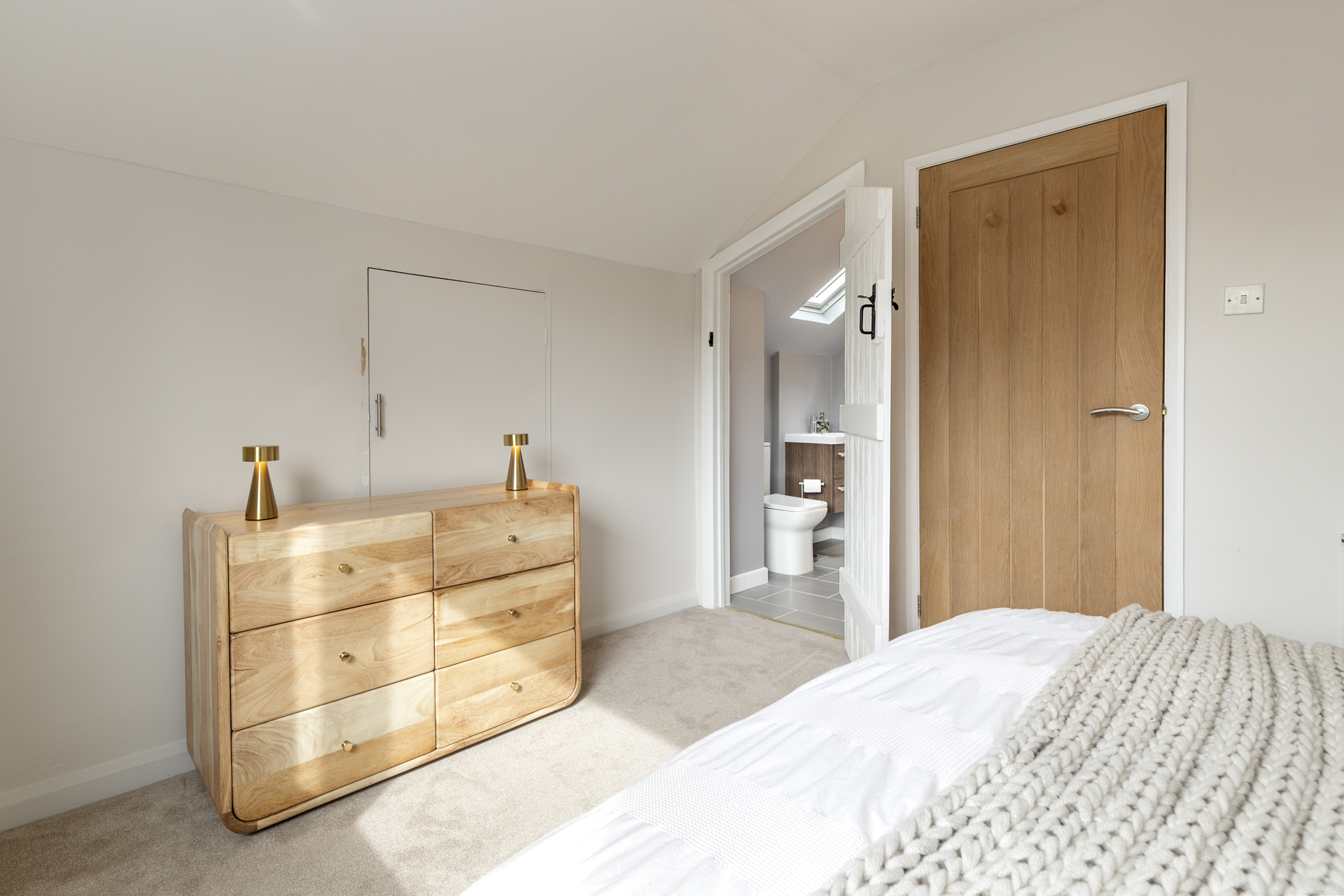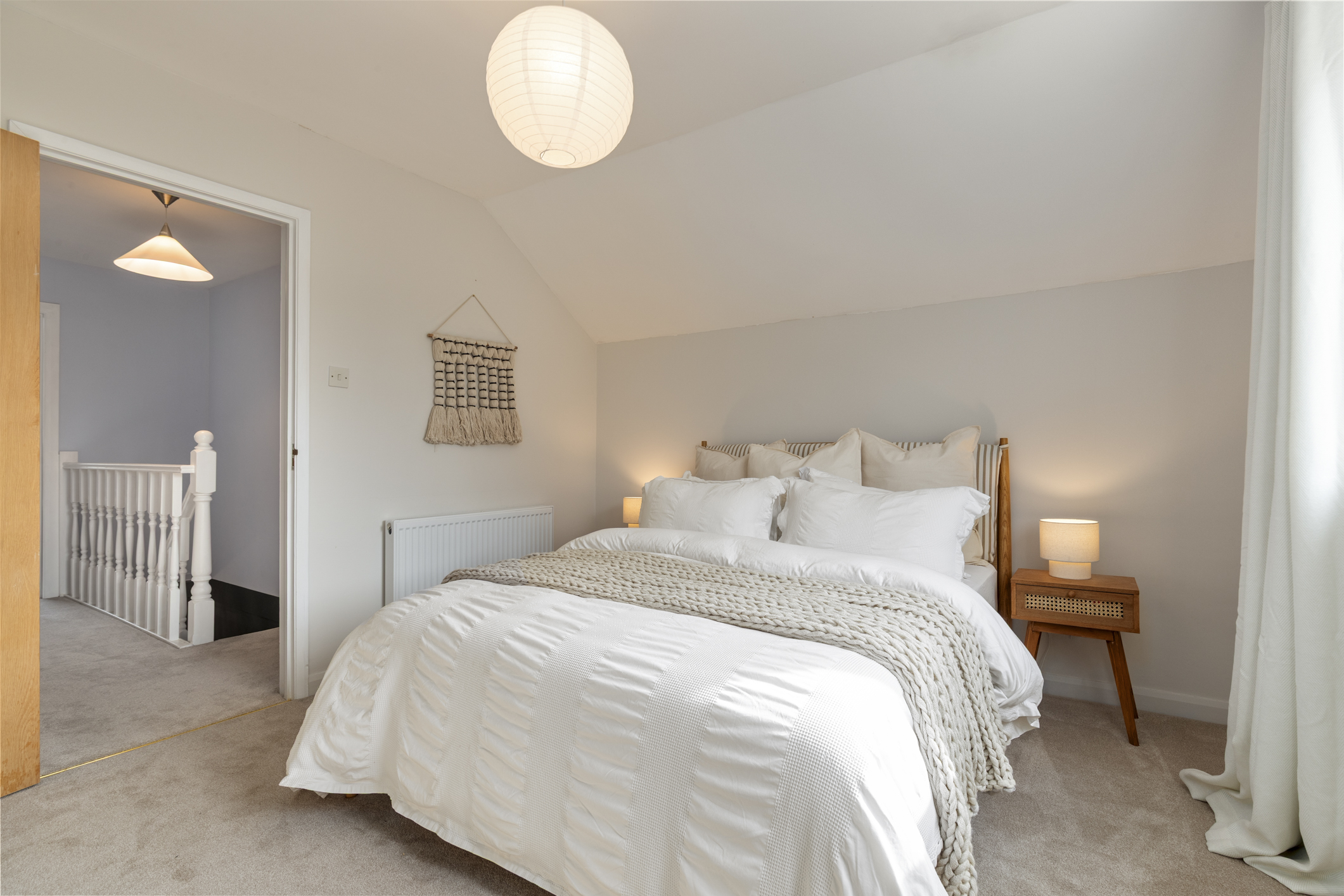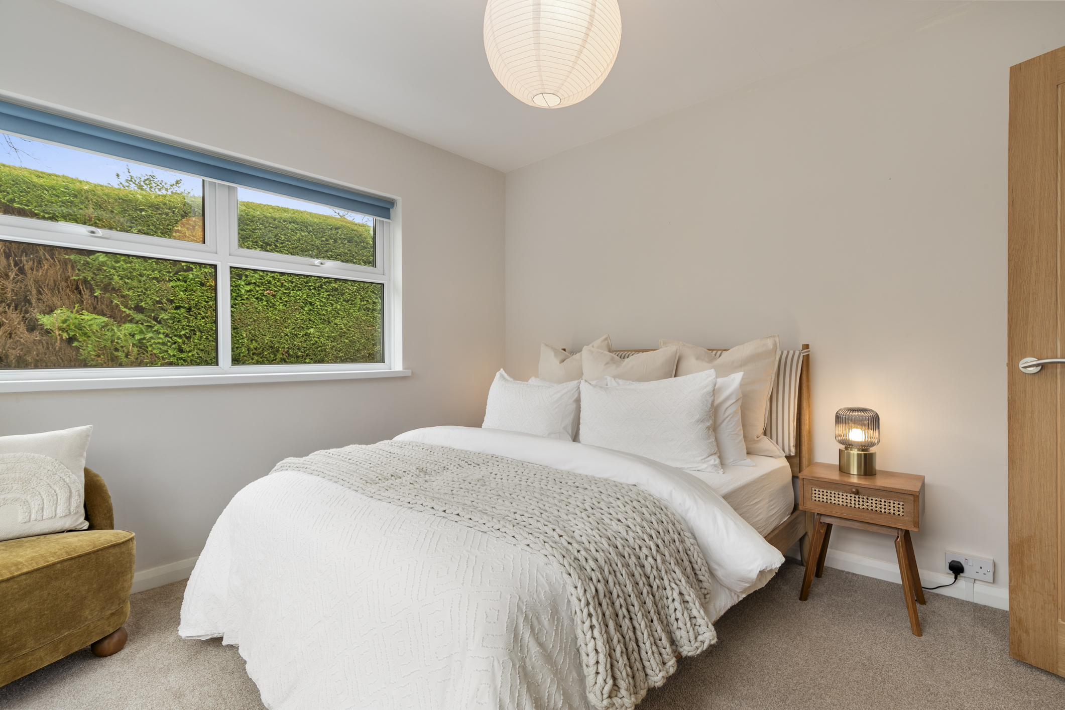 Upstairs, you’ll find a bright and airy king-sized bedroom, offering a peaceful retreat. The room is thoughtfully furnished with a comfortable king-sized bed, bedside table and lamp, and a chest of drawers for your belongings.