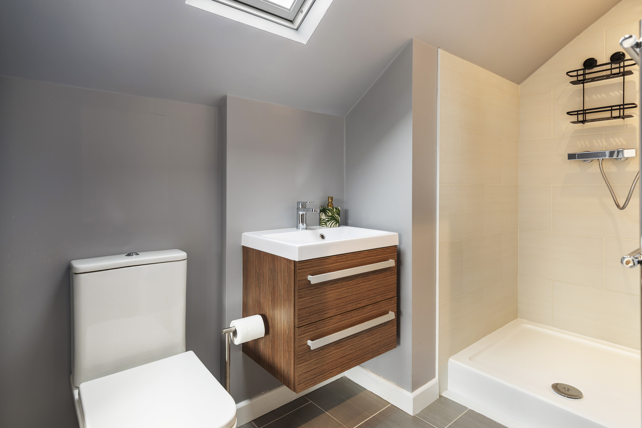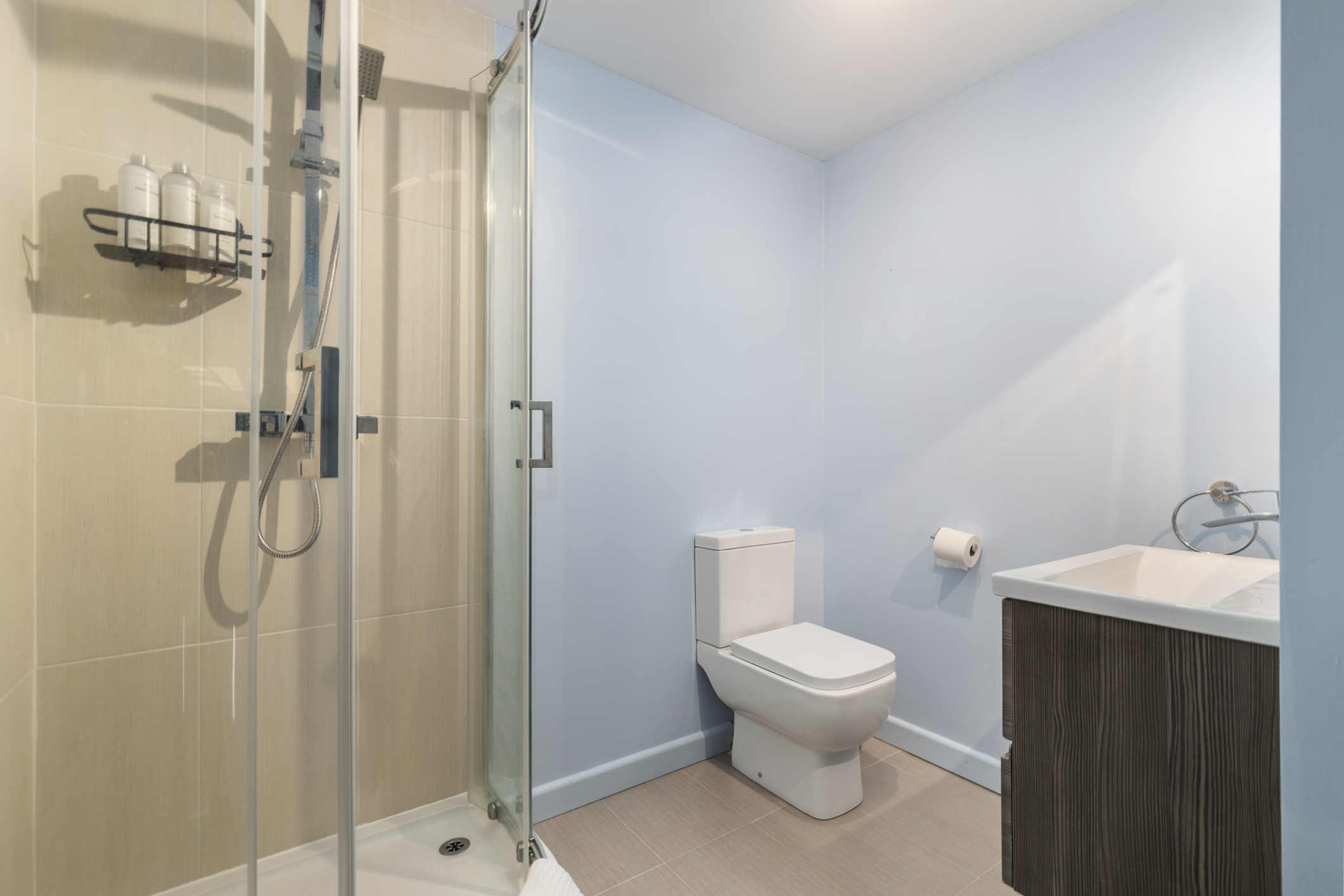 The ensuite shower room features a refreshing rain shower, along with a toilet, wash basin with storage drawers, and a heated towel rail, providing both comfort and convenience.