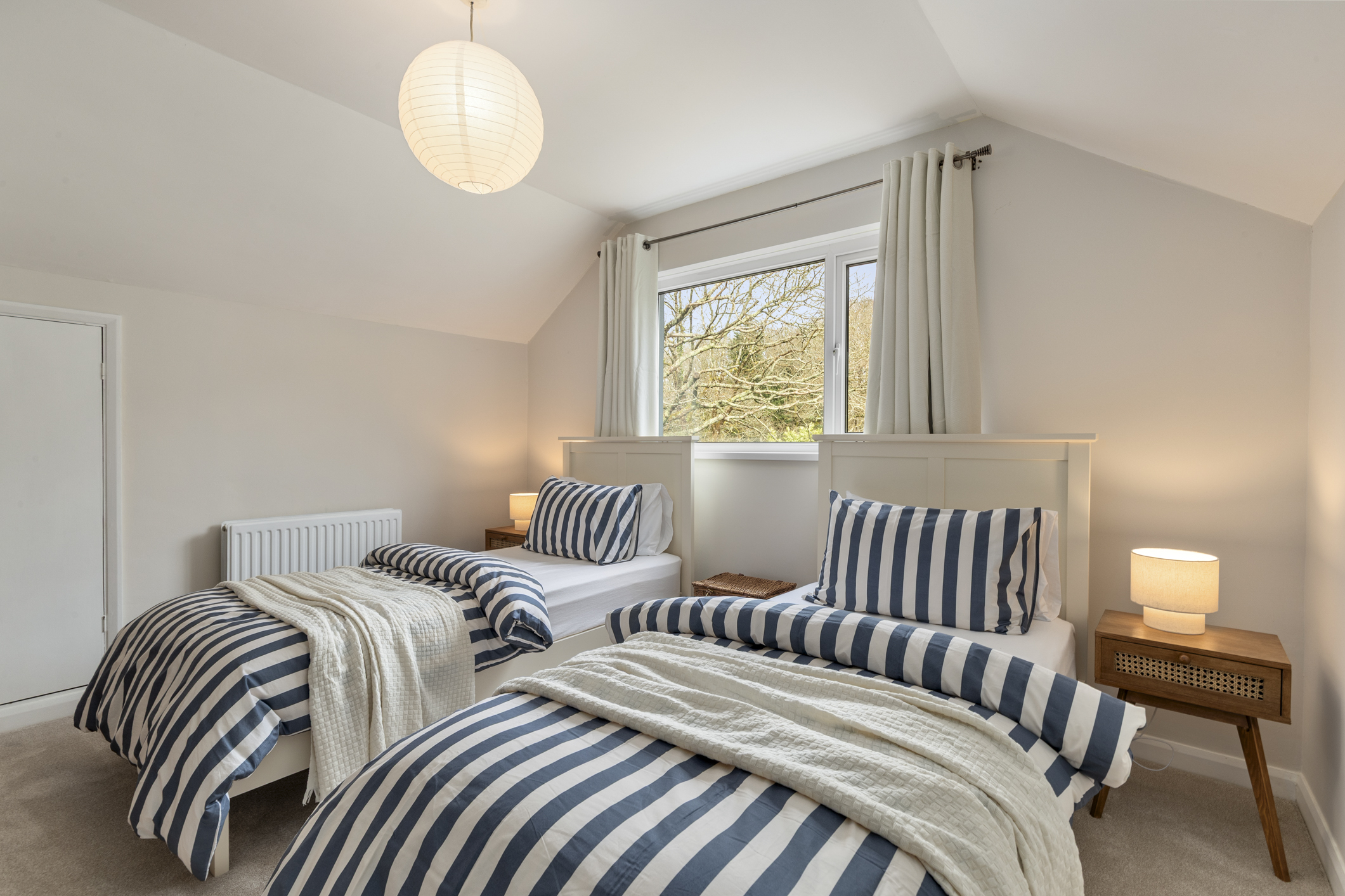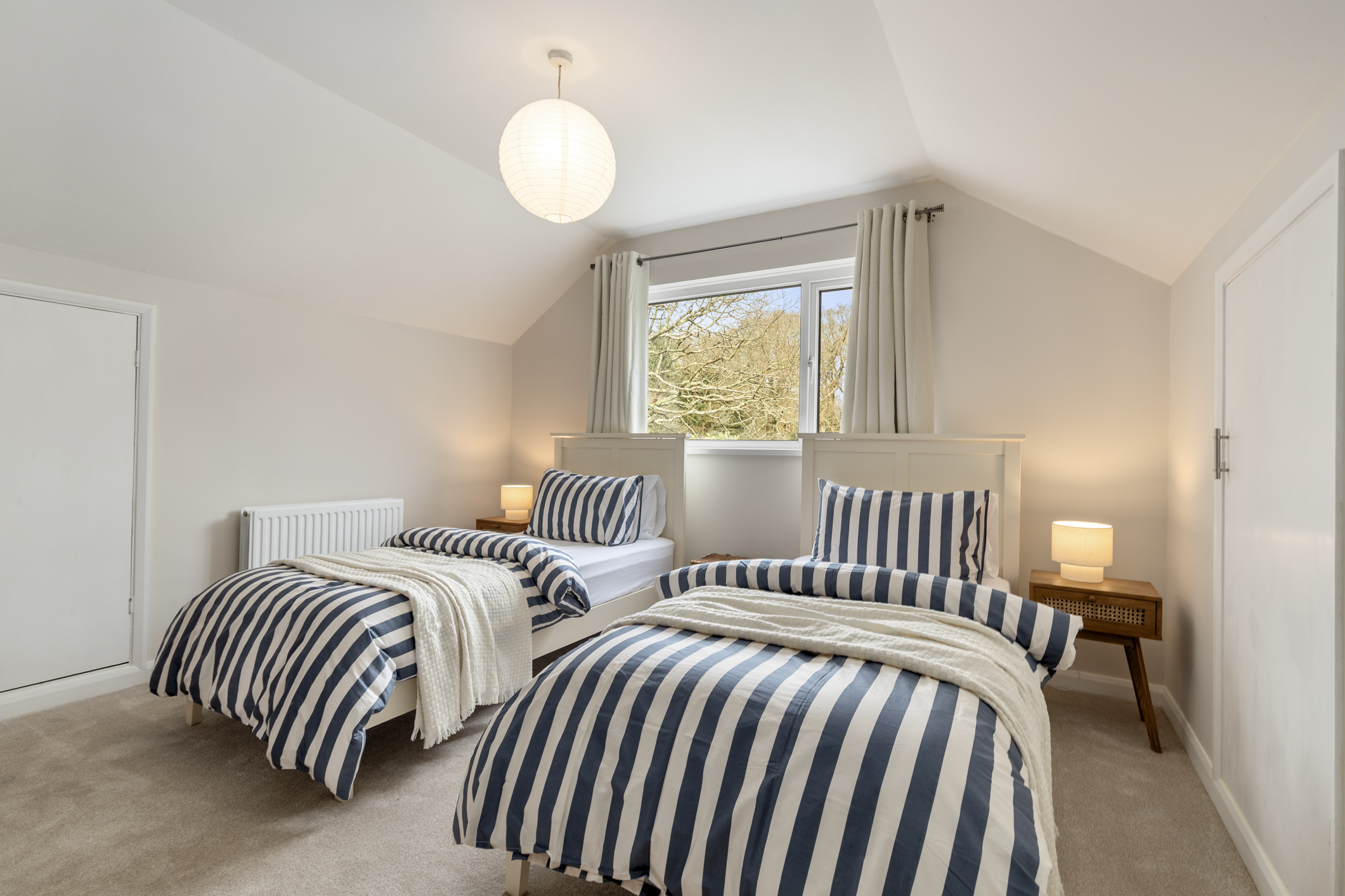 Also upstairs, you’ll find a spacious twin bedroom, ideal for children or additional guests. The room is comfortably furnished with bedside tables and lamps, a wardrobe cupboard, and a chest of drawers, providing plenty of storage for a relaxed and organised stay.